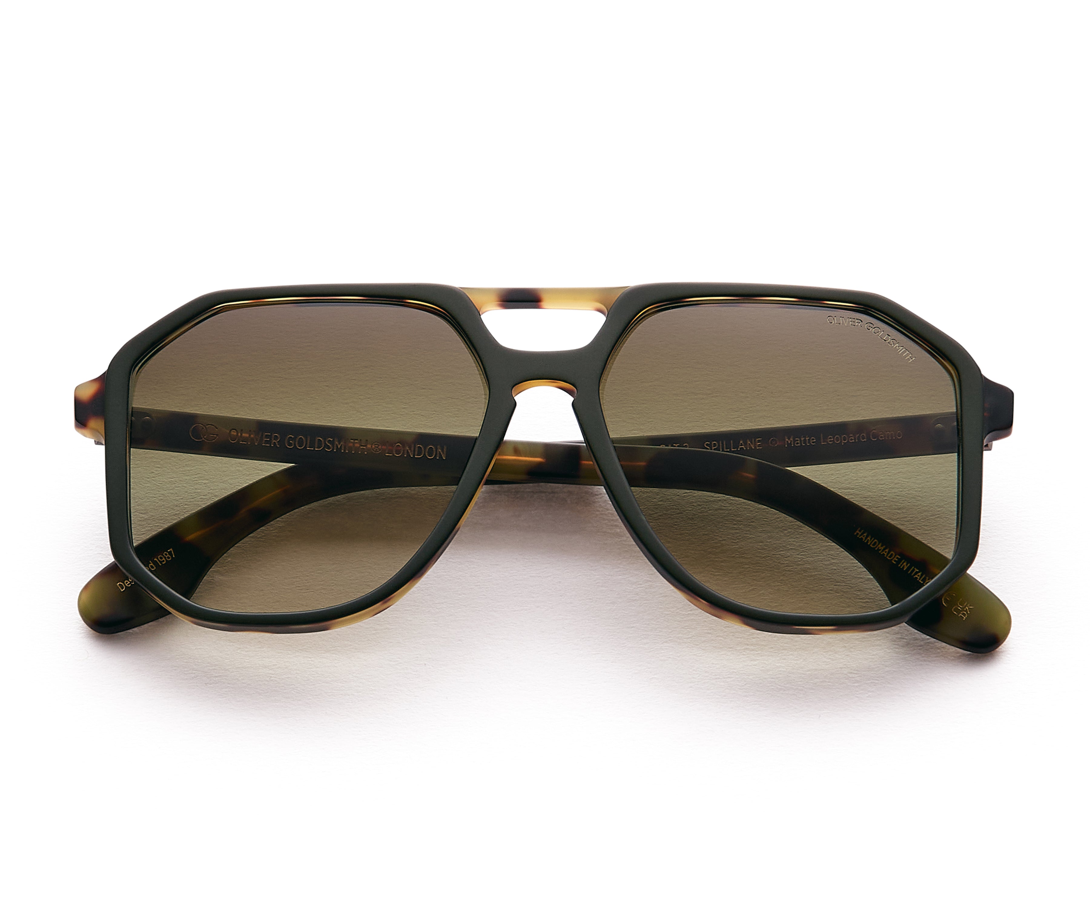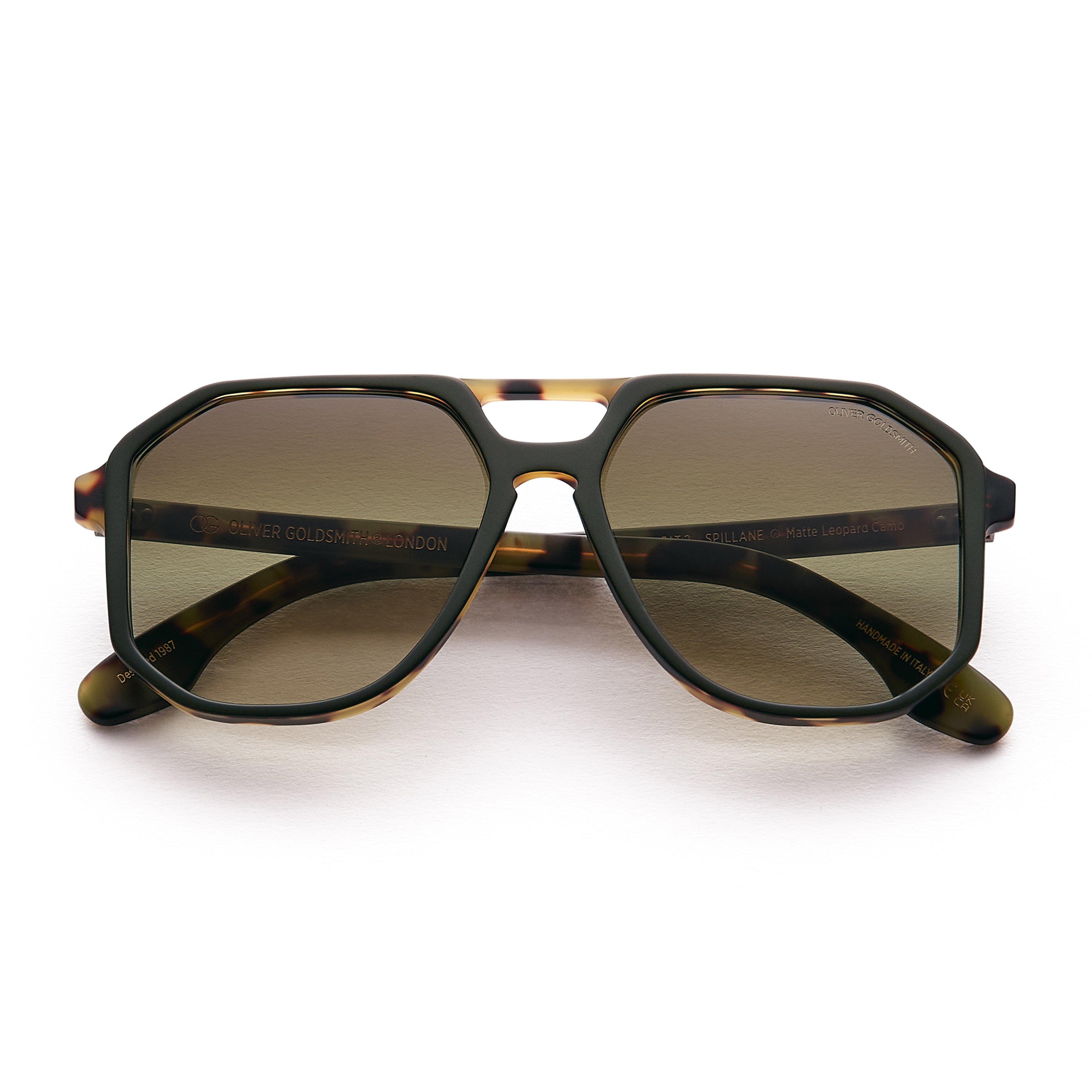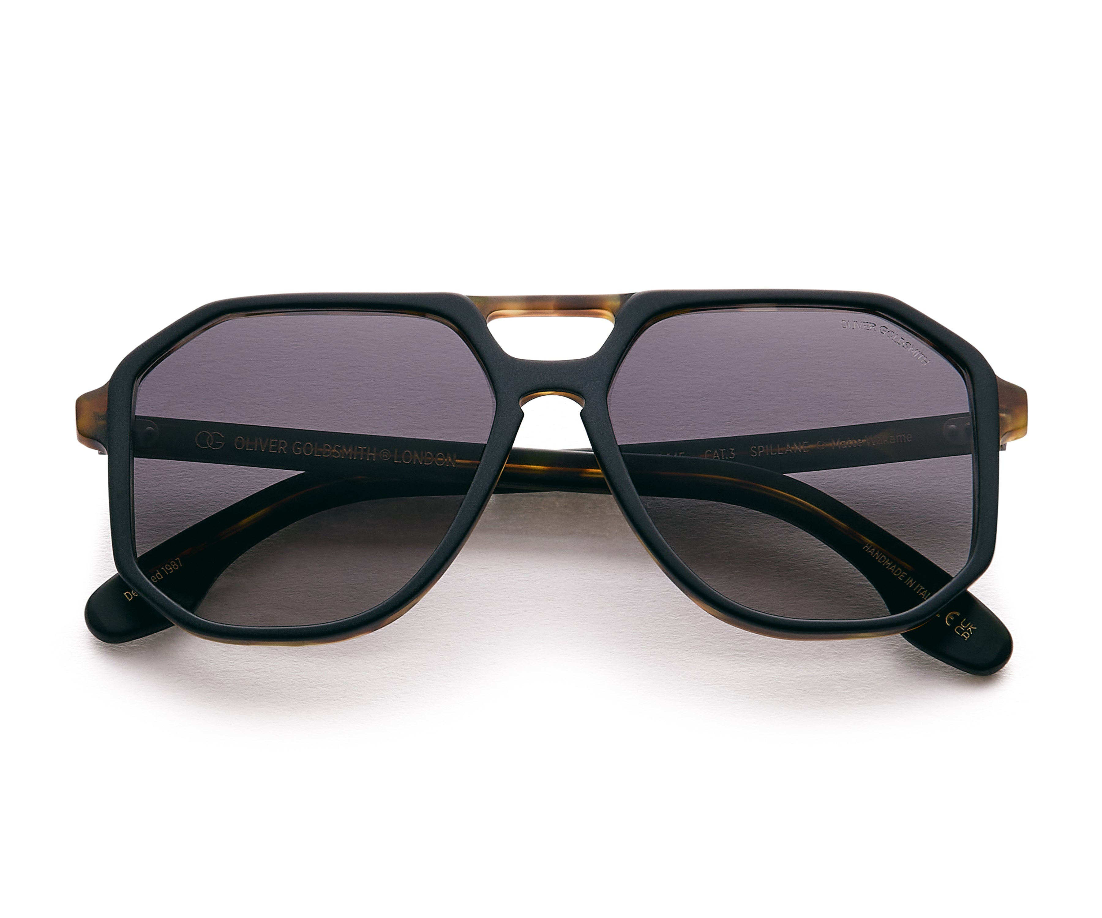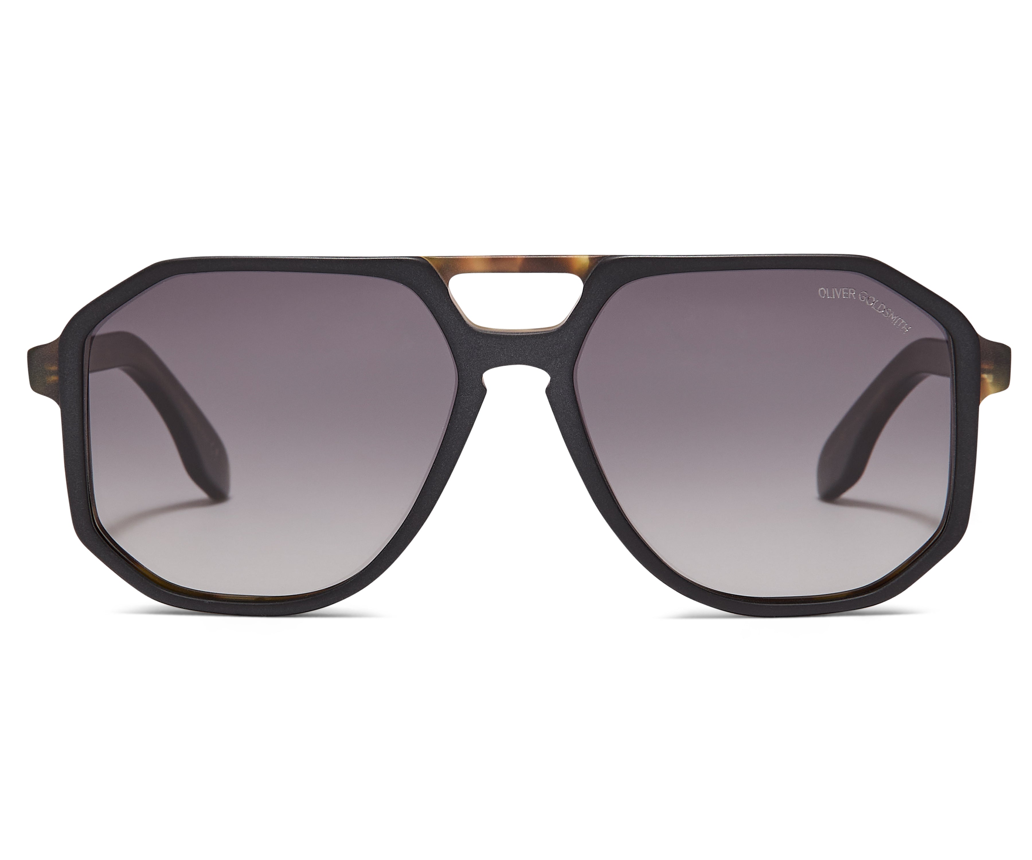 The Spillane is an oversized box aviator featuring a cutaway at the bridge and a strong straight brow line.